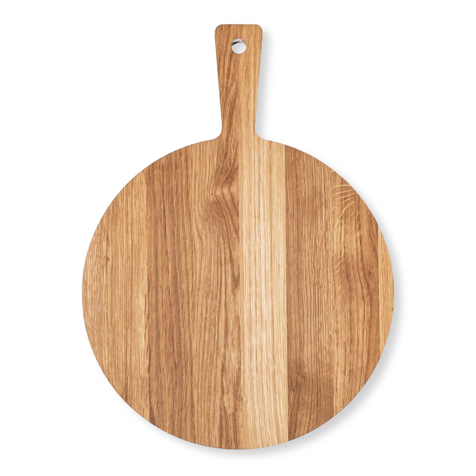 Minimaltisik rundt serveringsbræt i massiv egetræ med håndtag. Kan også bruges som skærebræt.