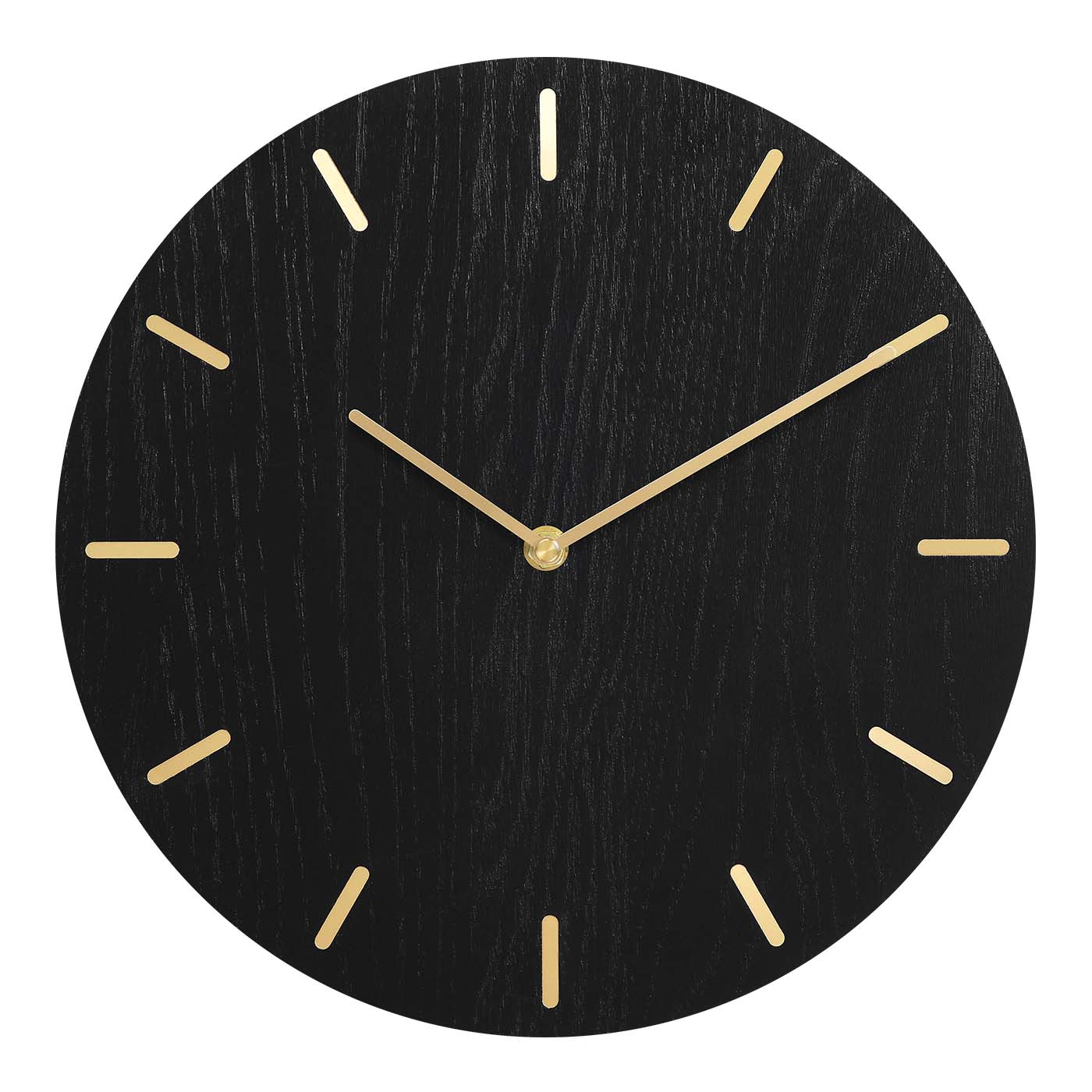 Dette vægur i sortlakeret egetræ kombinerer enkelthed og naturlig skønhed. Det er lavet af massiv eg og har en diameter på 30 cm og en tykkelse på 3 cm. De 12 guldfarvede timestreger kombineret med visere i guldfarve skaber et elegant og stilrent udtryk, mens urværket er skjult bagpå for et strømlinet look. Uret har et lydløst urværk, så du kan nyde roen uden forstyrrende tikken.Træet er sortlakeret på en måde, der fremhæver de naturlige og karakterfulde årer i egetræet, hvilket tilføjer dybde og elegance til designet.