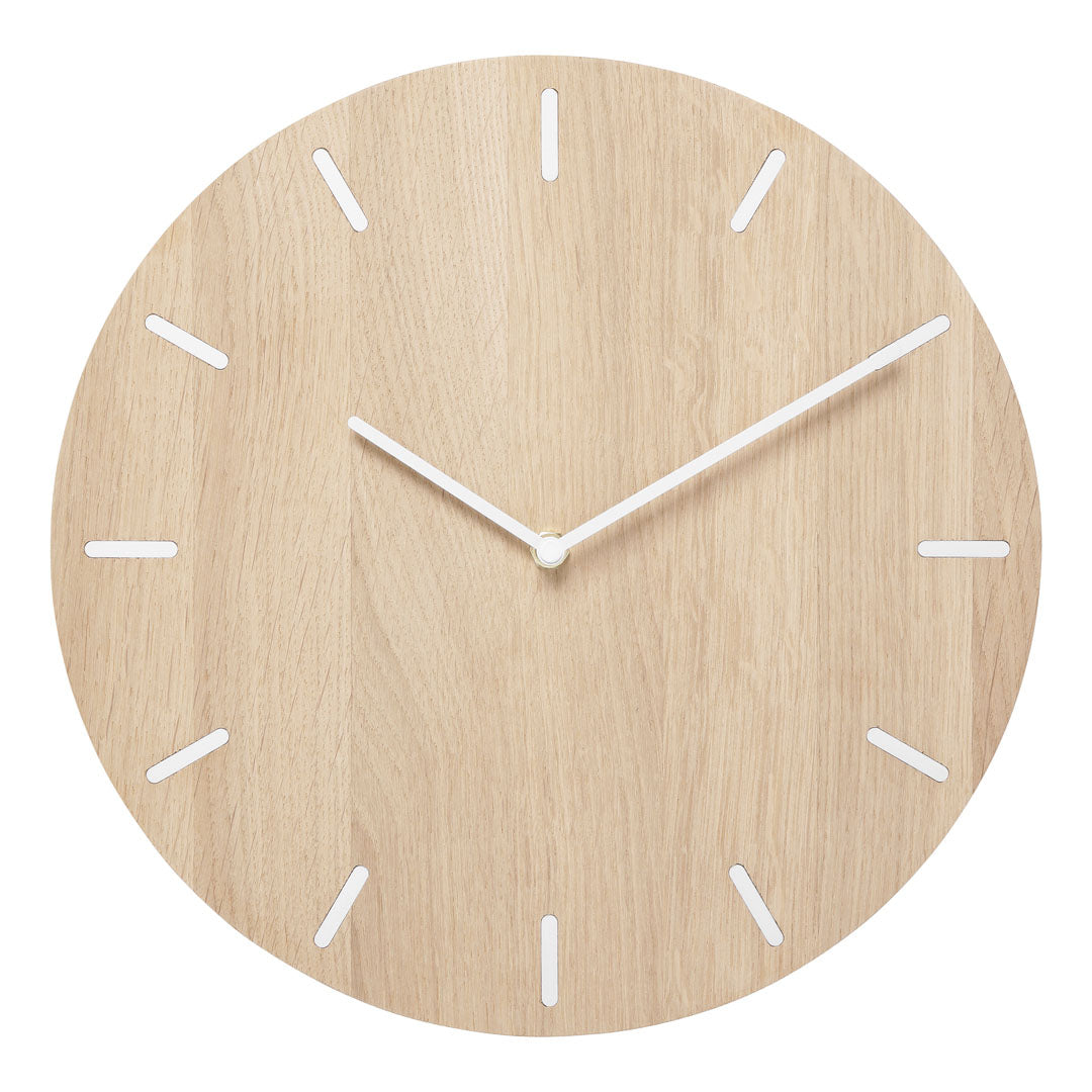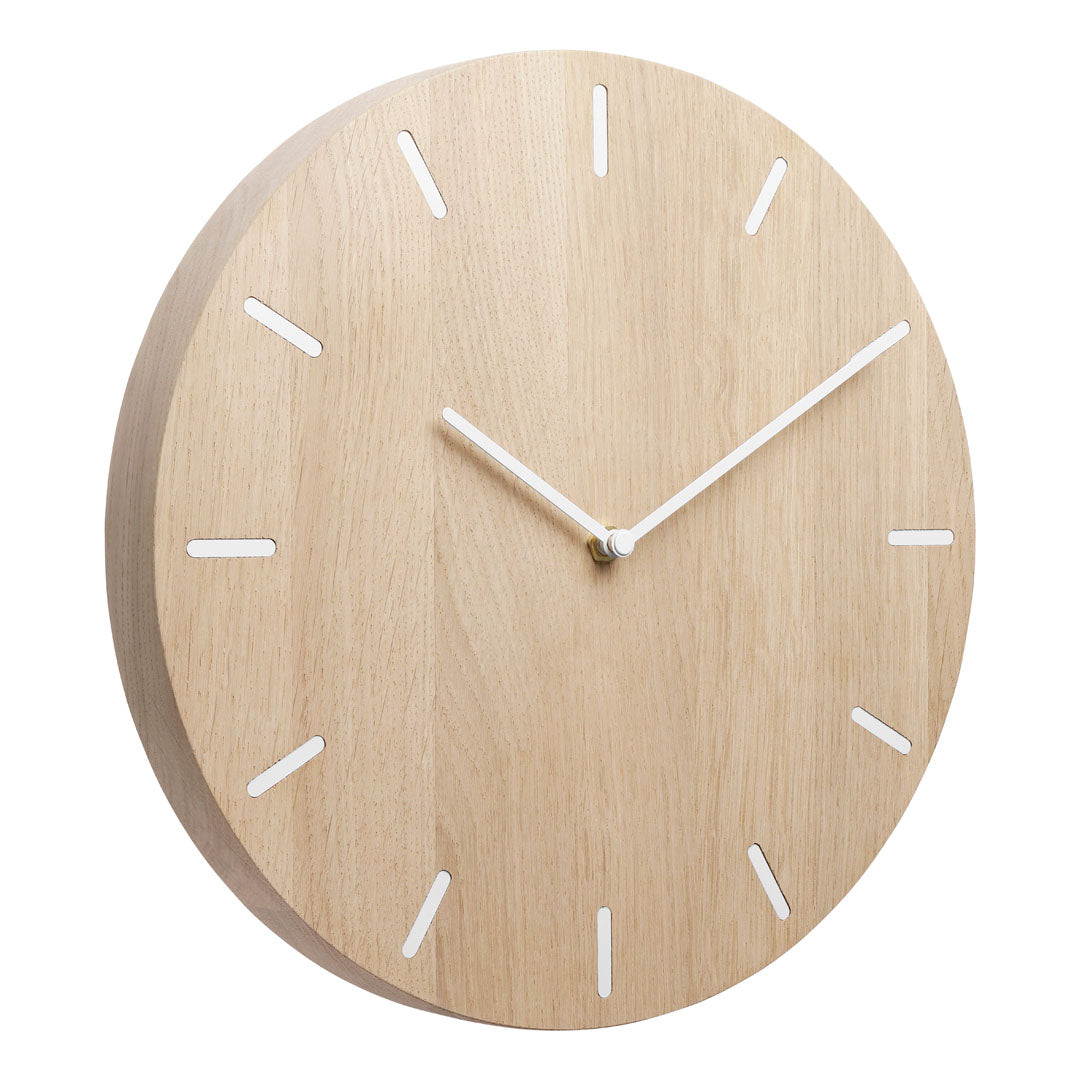 Dette vægur i egetræ kombinerer enkelthed og naturlig skønhed. Det er lavet af massiv eg, og har en diameter på 30 cm og en tykkelse på 3 cm. De 12 hvide timestreger giver et rent og minimalistisk udtryk, mens urværket er skjult bagpå for et strømlinet look. Uret har et lydløst urværk, så du kan nyde roen uden irriterende tikken.Træet er ubehandlet, hvilket giver dig mulighed for at bevare dets naturlige udseende eller give det en dybere farve ved at oliere det med eksempelvis vindruekerneolie.