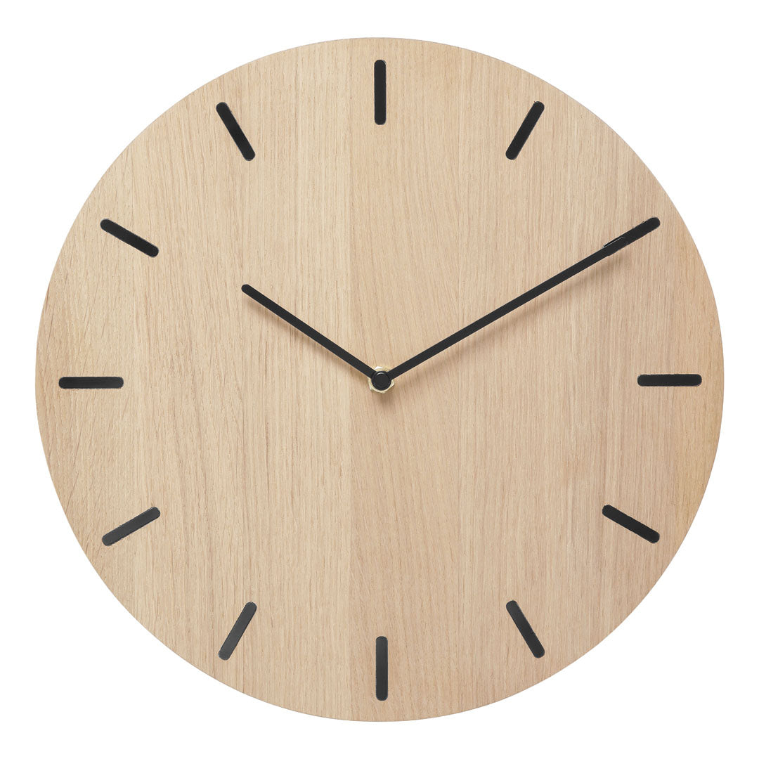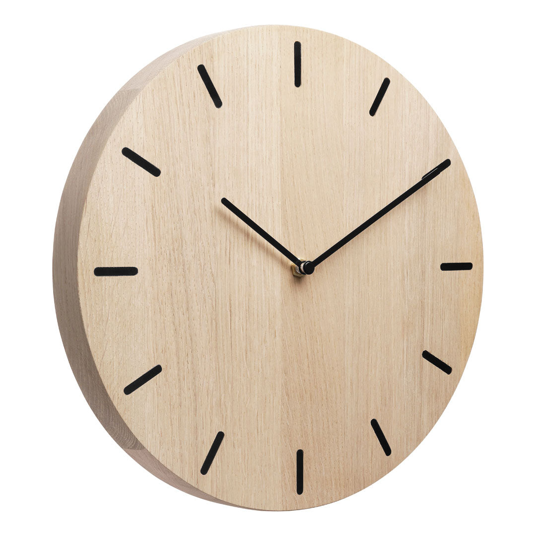 Dette vægur i egetræ kombinerer enkelthed og naturlig skønhed. Det er lavet af massiv eg og har en diameter på 30 cm og en tykkelse på 3 cm. De 12 sorte timestreger og matchende visere giver et skarpt og minimalistisk udtryk, mens urværket er skjult bagpå for et strømlinet look. Uret har et lydløst urværk, så du kan nyde roen uden forstyrrende tikken.