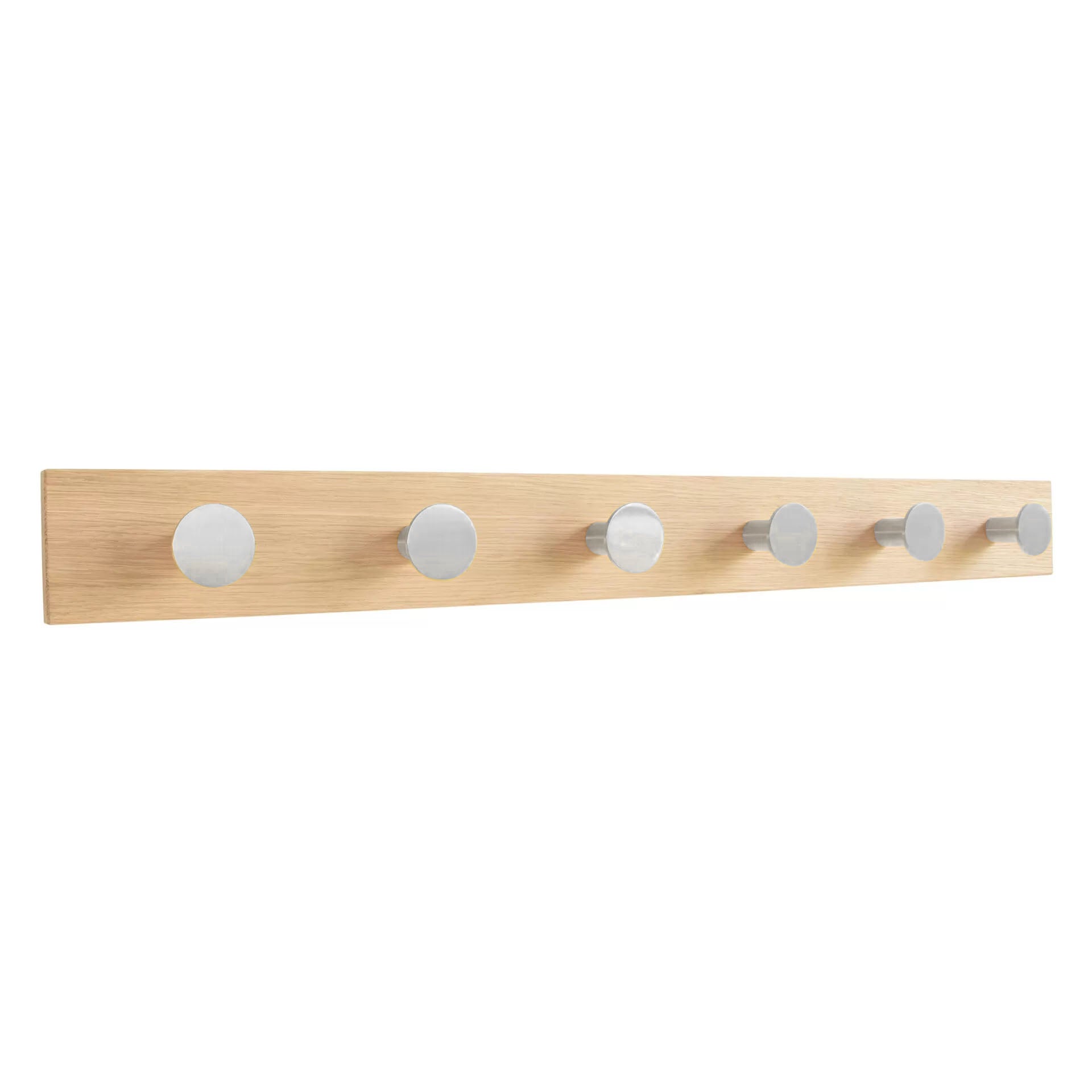 Smuk minimalistisk knagerække med i eg med knager i rustfri stål og skjulte magneter.