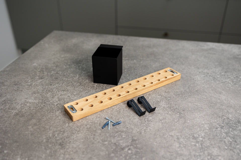 Det er super nemt at montere knivskinnen med de tilhørende 2 skruer og rawplugs. Skruerne vil efter montering være skjulte bag skinnen, så du får det mest enkle udtryk som muligt.