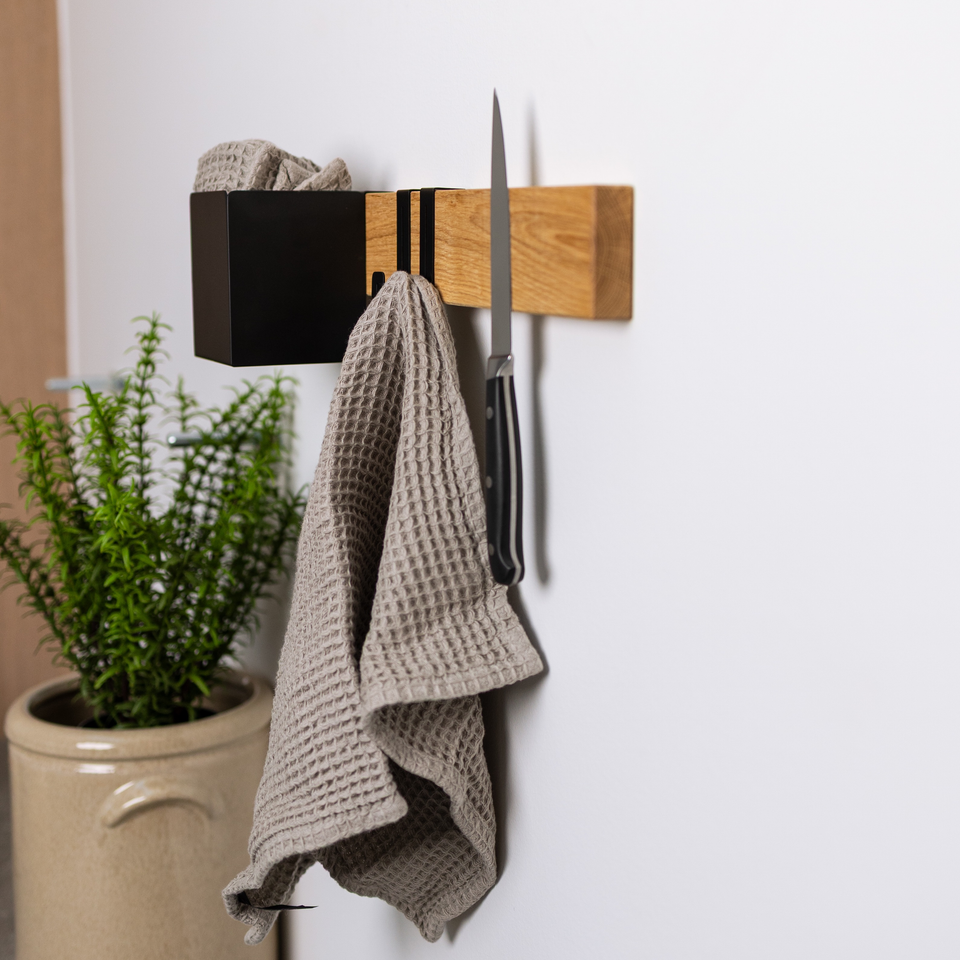 Vores knivmagnet i egetræ er lavet i et minimalistisk design, som passer ind i de fleste køkkener. Den findes i tre længder 30 cm, 40 cm og 60 cm, er 6 cm høj og 2 cm tyk. Træet har en lækker slebet overflade, og er olieret i dansk økologisk linolie. Olien fremhæver de flotte årer, og den flotte farve egetræet har.Knivmagneten er meget kraftig. Faktisk vil vi vove at påstå, at der er en af de stærkeste knivmagneter du kan finde.