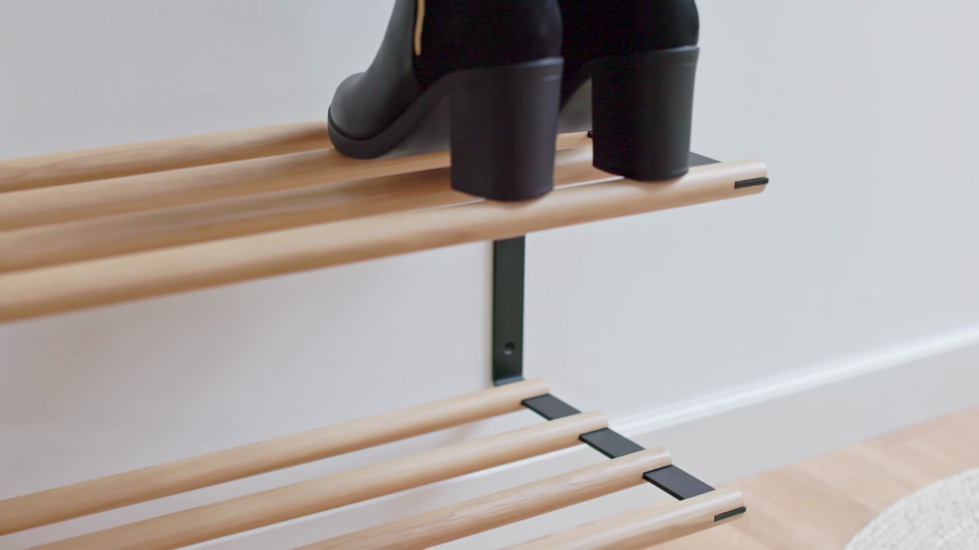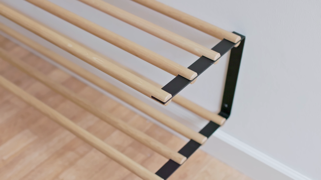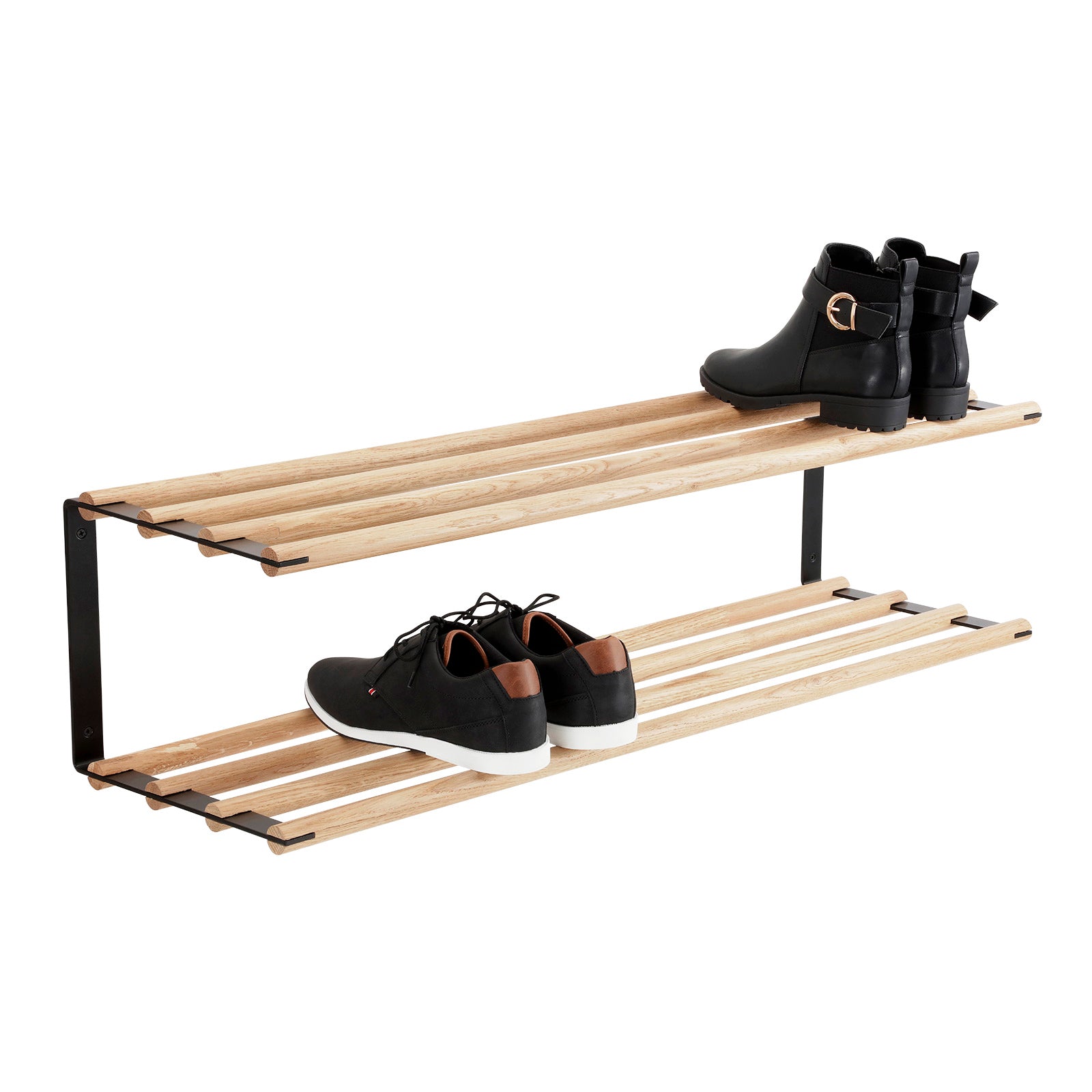 Vores minimalistiske og elegante skoreol er lavet af egetræ og sort pulverlakeret stål.Skoreolen hænges op på væggen og har to rækker til sko. Ved at hænge skoreolen højt på væggen, kan der gøres plads til sko under den.